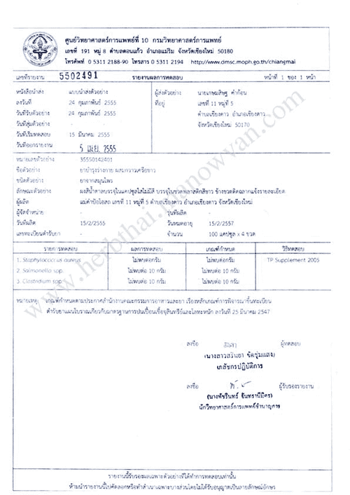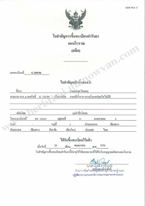 ยาแคปซูลบำรุงร่างกายผสมกวาวเครือขาว ทะเบียนยา G 214/55 Medicall license and Pharmaceutical registration G 214/55 ผู้ผลิต โรงงานแม่คำป้อโอสถ 11ซอย2 ม.5 ต.เชียงดาว อ.เชียงดาว จ.เชียงใหม่ 50170 ทะเบียนยากวาวเครือขาว ใบตรวจวิเคราะห์กวาวเครือขาว Share this: Click to share on Facebook (Opens in new window) Facebook Click to share on X (Opens in new window) X Like this:Like Loading...